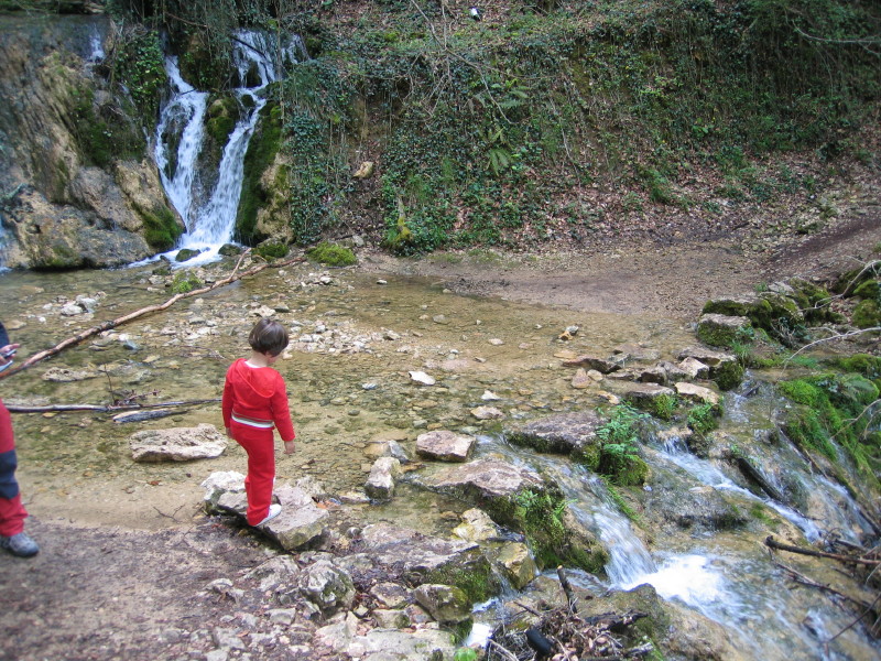 Continuamos ya a pie descendiendo por la carretera hasta el pueblo de Villabascones. La ruta comienza junto a la iglesia ( N 42.96876 W3.74389 Alt. 770 metros ). Poco a poco nos imbuímos en la espesura del hayedo y a 300 metros nos encontramos con una primera cascada y la obligación de cruzar el río por unas piedras, ya que éste atraviesa el camino por el que vamos.