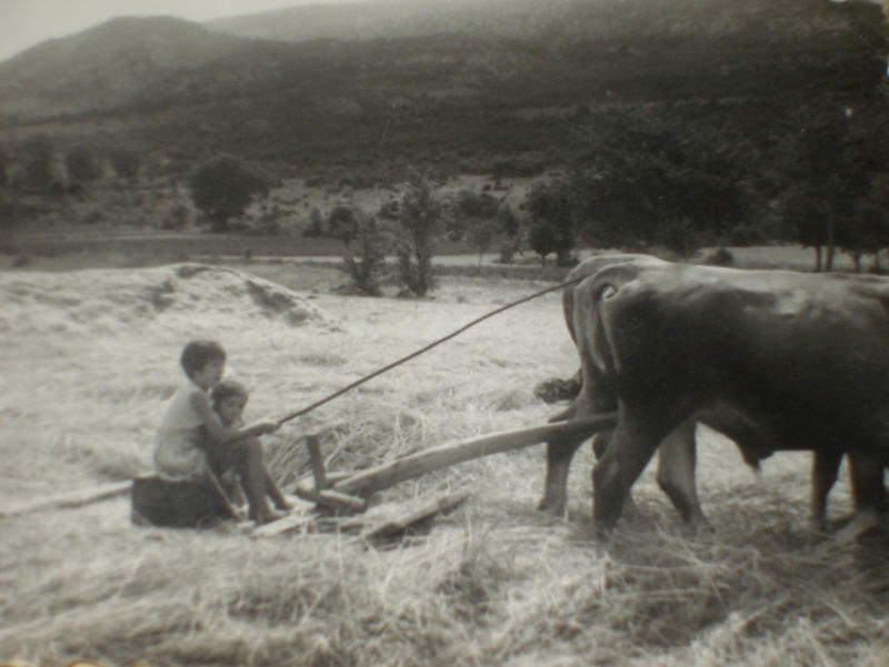 Lucia y Noemi trillando en la era de Cristobal, junto al camino a Manzanedillo, al fondo la Sierra.